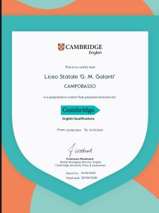 Stampa / Condividi Stampa Invia Condividi Facebook Twitter Linkedin Whatsapp Certificato Preparation Centre 2024-25CAMBRIDGE QUALITY CERTIFICATION 2023-2024